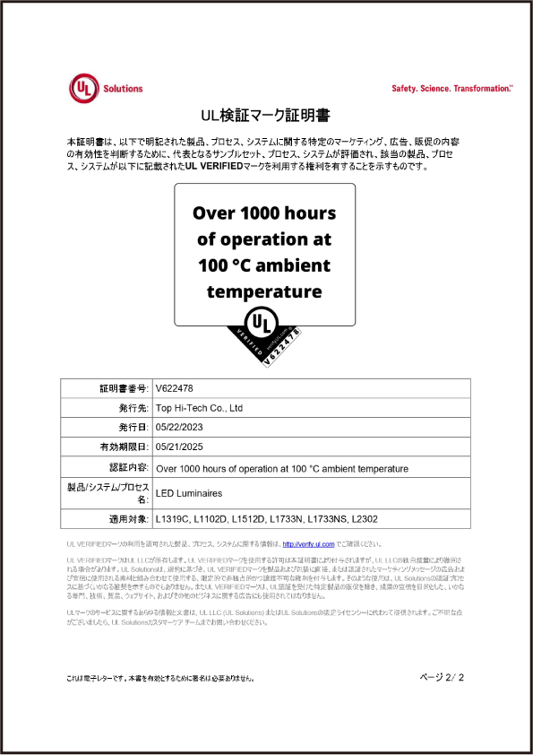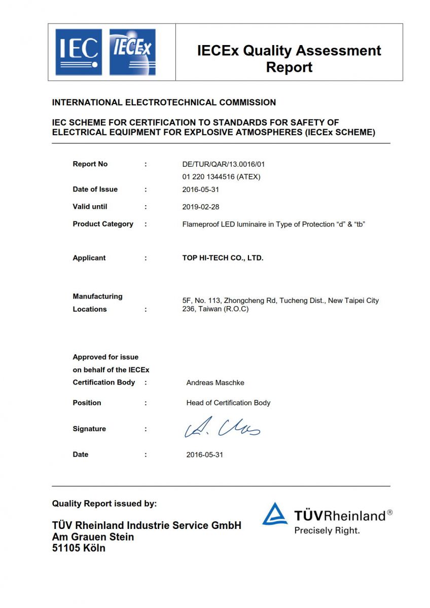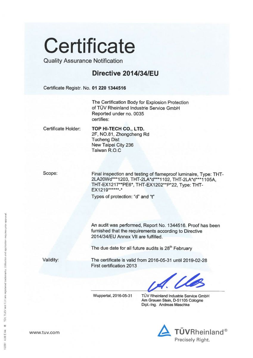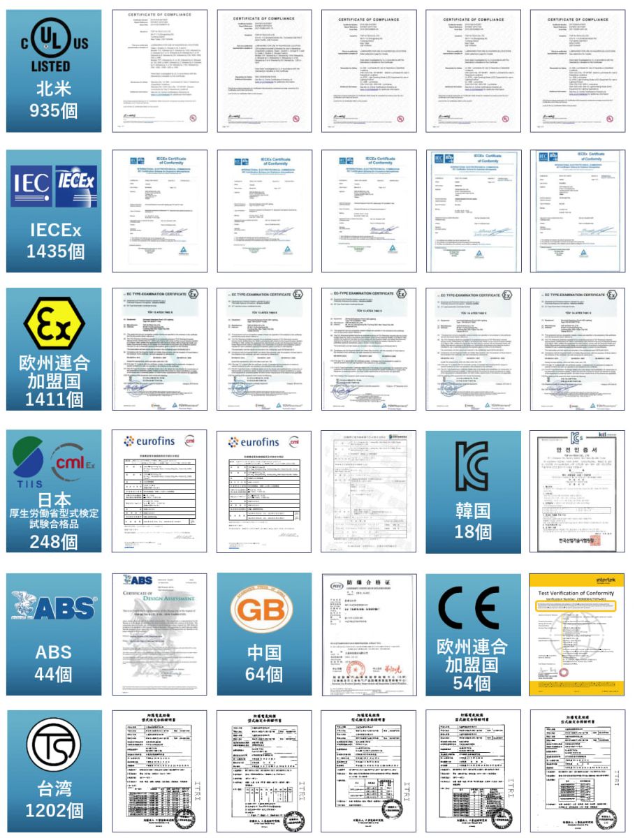 久鑫科技股份有限公司(THT-EX)は、2011年に国際規格ISO 9001、ISO 14001の認証を取得しました。弊社の防水防爆LED製品のグローバルな防爆認証の取得とIP68の防水標準の獲得を目標としております。THT-EXは各認証制度を通じて自社製品の検証を確認し、厳密性、最高水準レベルのデザイン、イマジネーションを駆使し、お客様に多角的・信頼・安全な製品を提供し、商品の最終目標として、お客様の安全を確保することに尽力します。
