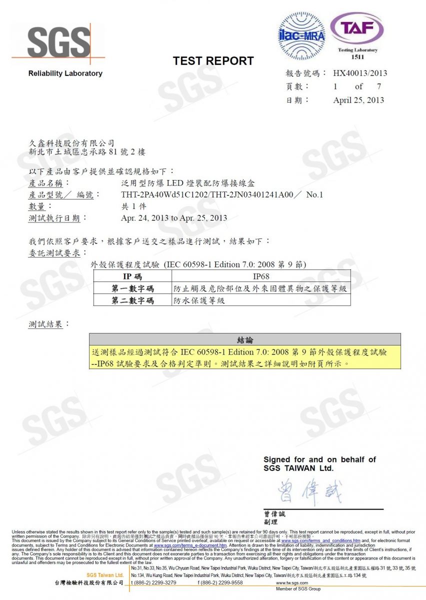 久鑫自行研發設計之防爆接線盒日前通過 SGS 防水防塵最高等級IP68測試。IP68防水防塵防護等級為全面防塵(完全防止外物侵入、且可完全防止灰塵進入),並可置入2米深水中30分鐘而無進水。