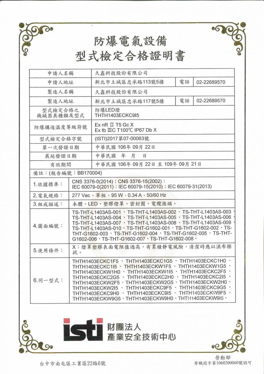 弊社防爆形LED照明シーリズの新製品、型番L1403ASについて、台湾のTS防爆認定を取得しました。危険区域ゾーン2に適用しています。ワット数65W/75W/80W/