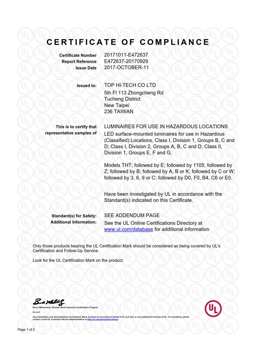 先日、弊社の防爆製品、型番L1105が米国の防爆認証ULを取得していました、保護等級最高級のC1D1区域にで使用可能です。
