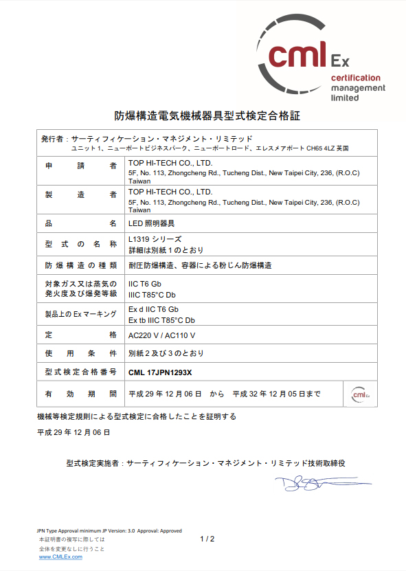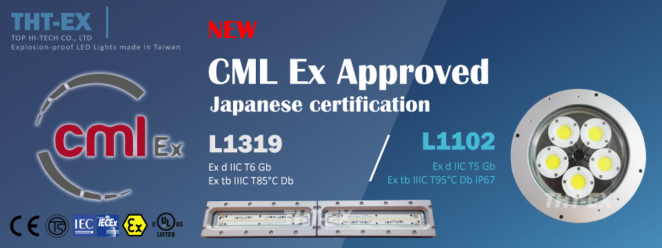 最近THT-EXの防爆形LED照明製品、型番L1102とL1319が日本のCML防爆認証を取得しています。台湾における唯一認定されたAC IN防爆型LED照明です。