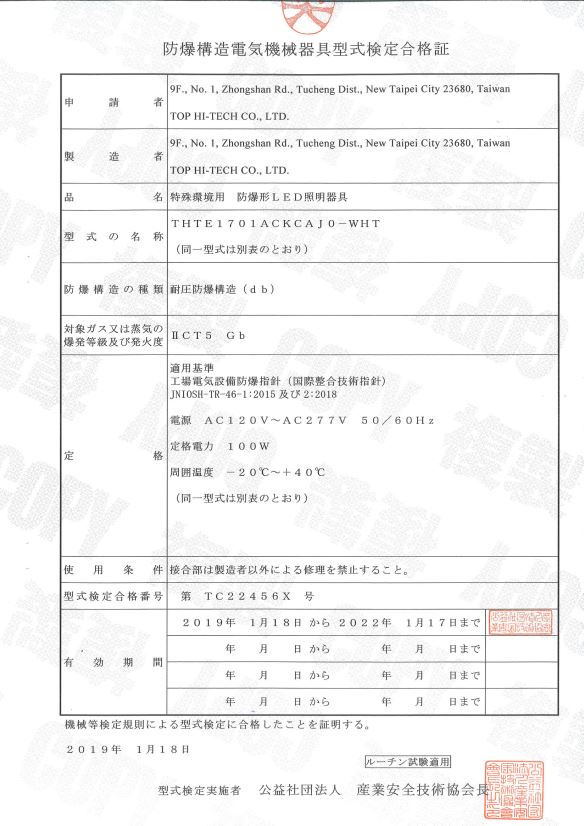 THT-EX 防爆LED照明L1701 厚生労働省型式検定試験合格の報告です。