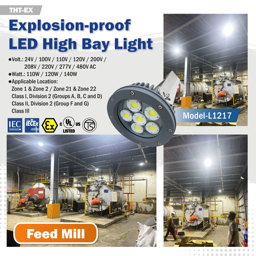 下記は防爆LED高天井用途として、弊社のL1217を飼料工場にて設置した実際の写真です。弊社は飼料工場用に400Wの従来の照明に代わる、120Wの防爆LED照明の使用をご提案致します。