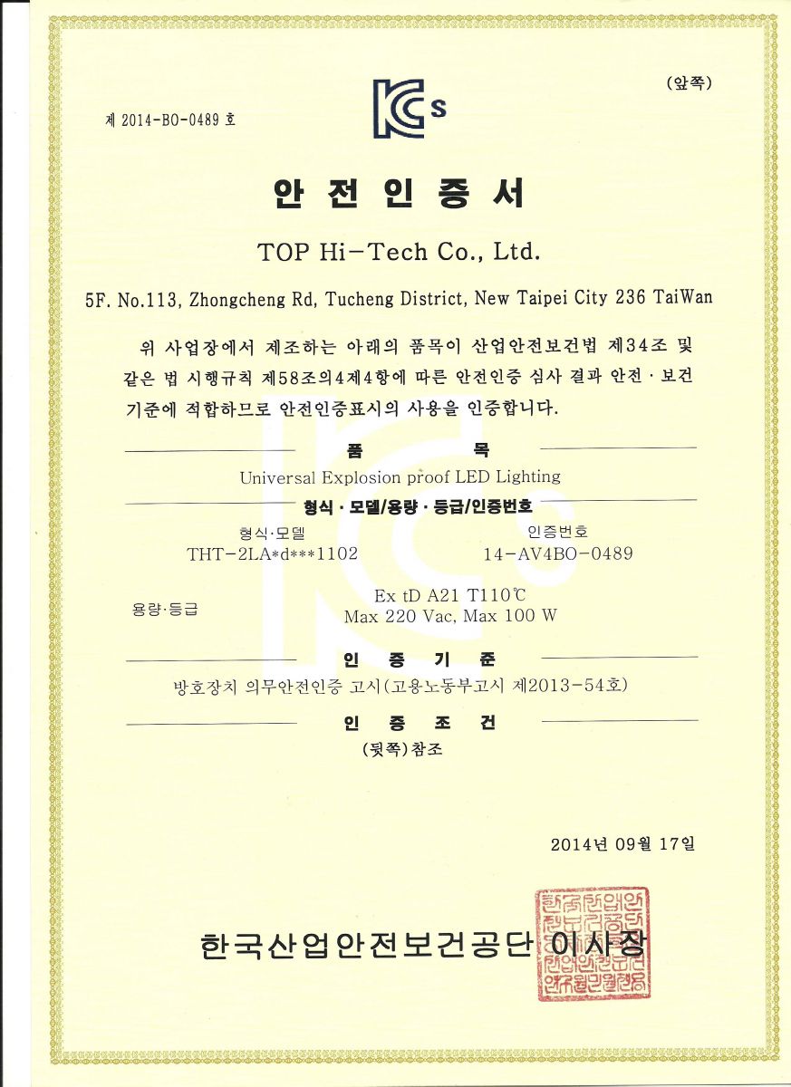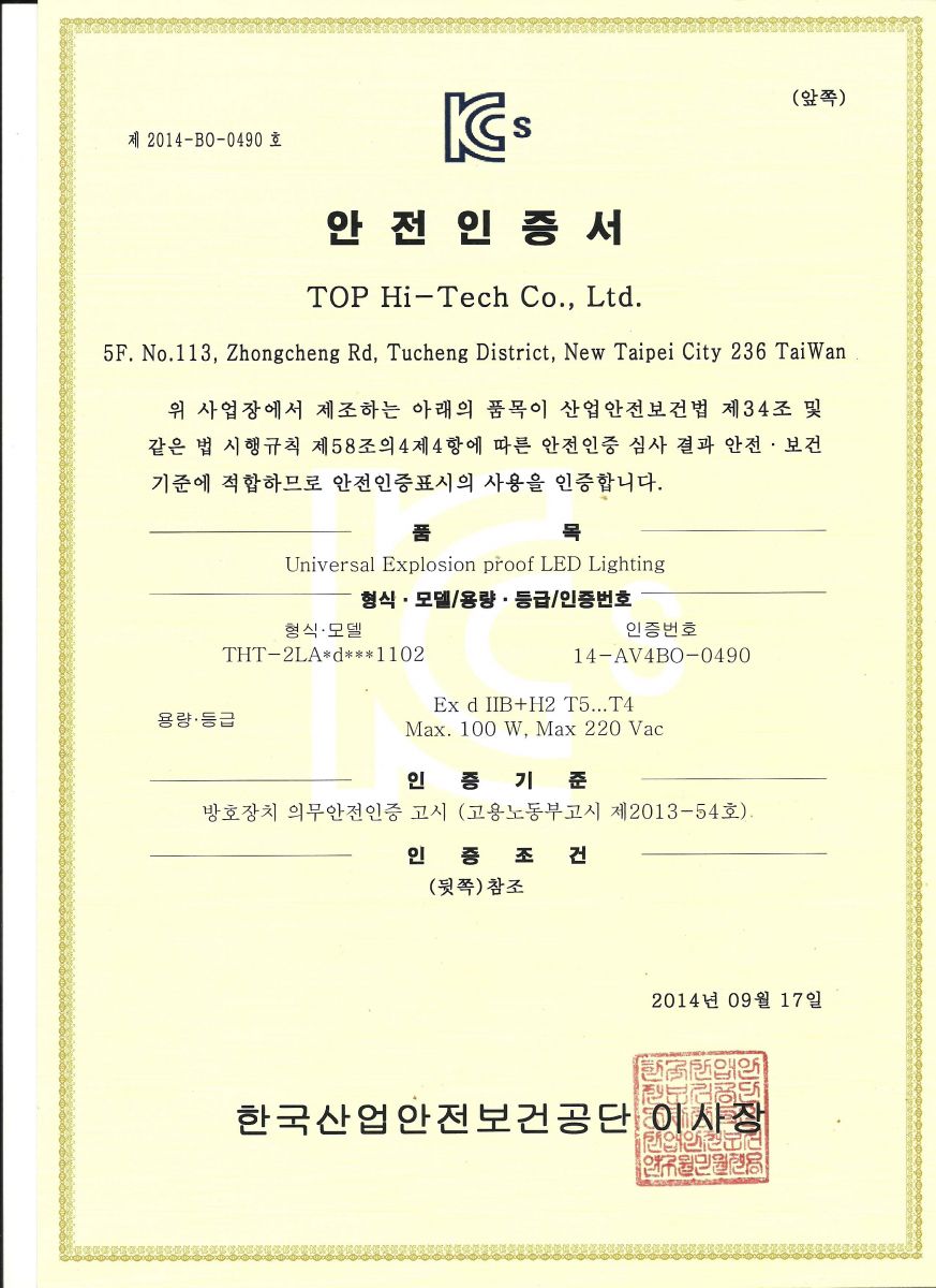 久鑫科技防爆LED照明(60W.80W.100W) KOSHA(韓国)の認証を合格しました! ワット数は60Wから100Wまで 多様かなお客様の要望に応じます、製品の外部温度はT5レベルで工安防護の最優秀選択になります。 当社が防爆LED製品の設計に努力し、一緒に美しい環境を守ってがんばっていきます!